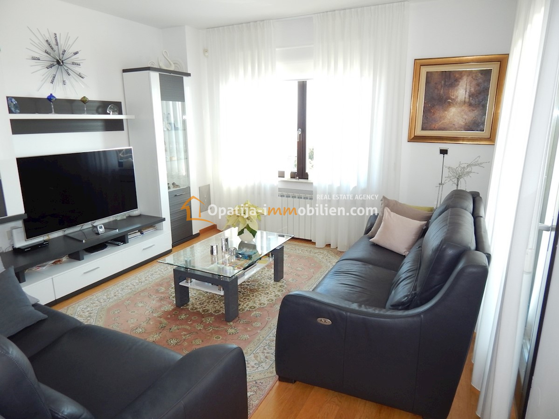 In the lower part of the apartment there is a hallway, a small bathroom, a kitchen with a dining area and a living room with an exit to the terrace. On the upper floor, which is connected by a circular staircase, there are three bedrooms, a bathroom and a large terrace with a magnificent view of the entire Kvarner. The apartment is sold furnished and equipped with high quality furniture. The central heating is electric, there is underfloor heating in the bathroom.